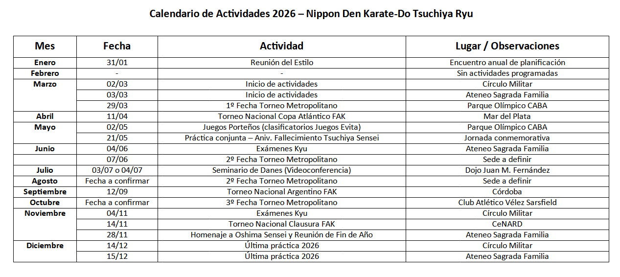 Del mismo modo, se estableció el inicio y fin de la actividad anual en las distintas sedes, se asignaron Mesas de Examen y se fijaron las fechas en que tendrán lugar la ya tradicional práctica conjunta en homenaje al legado de Oshima Sensei; a la que se añadirá la Primera Práctica Conjunta en Celebración del Karate del Maestro Tsuchiya, el próximo 21 de mayo, al cumplirse un año de la desaparición física del fundador del Estilo.