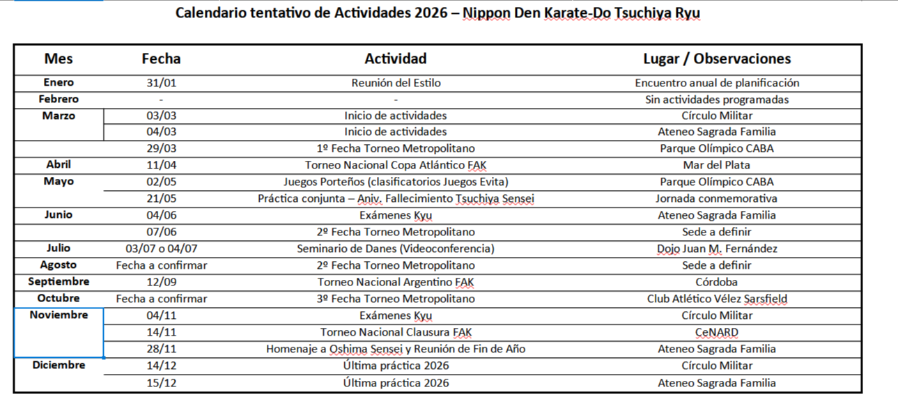Del mismo modo, se estableció el inicio y fin de la actividad anual en las distintas sedes, se asignaron Mesas de Examen y se fijaron las fechas en que tendrán lugar la ya tradicional práctica conjunta en homenaje al legado de Oshima Sensei; a la que se añadirá la Primera Práctica Conjunta en Celebración del Karate del Maestro Tsuchiya, el próximo 21 de mayo, al cumplirse un año de la desaparición física del fundador del Estilo.