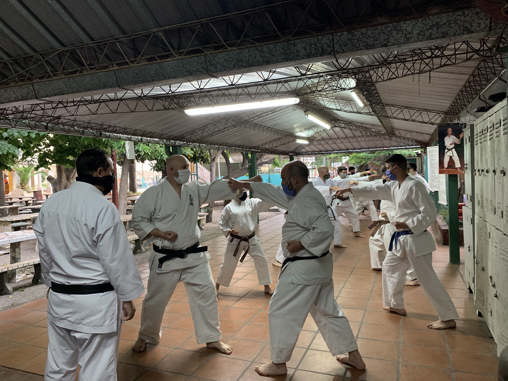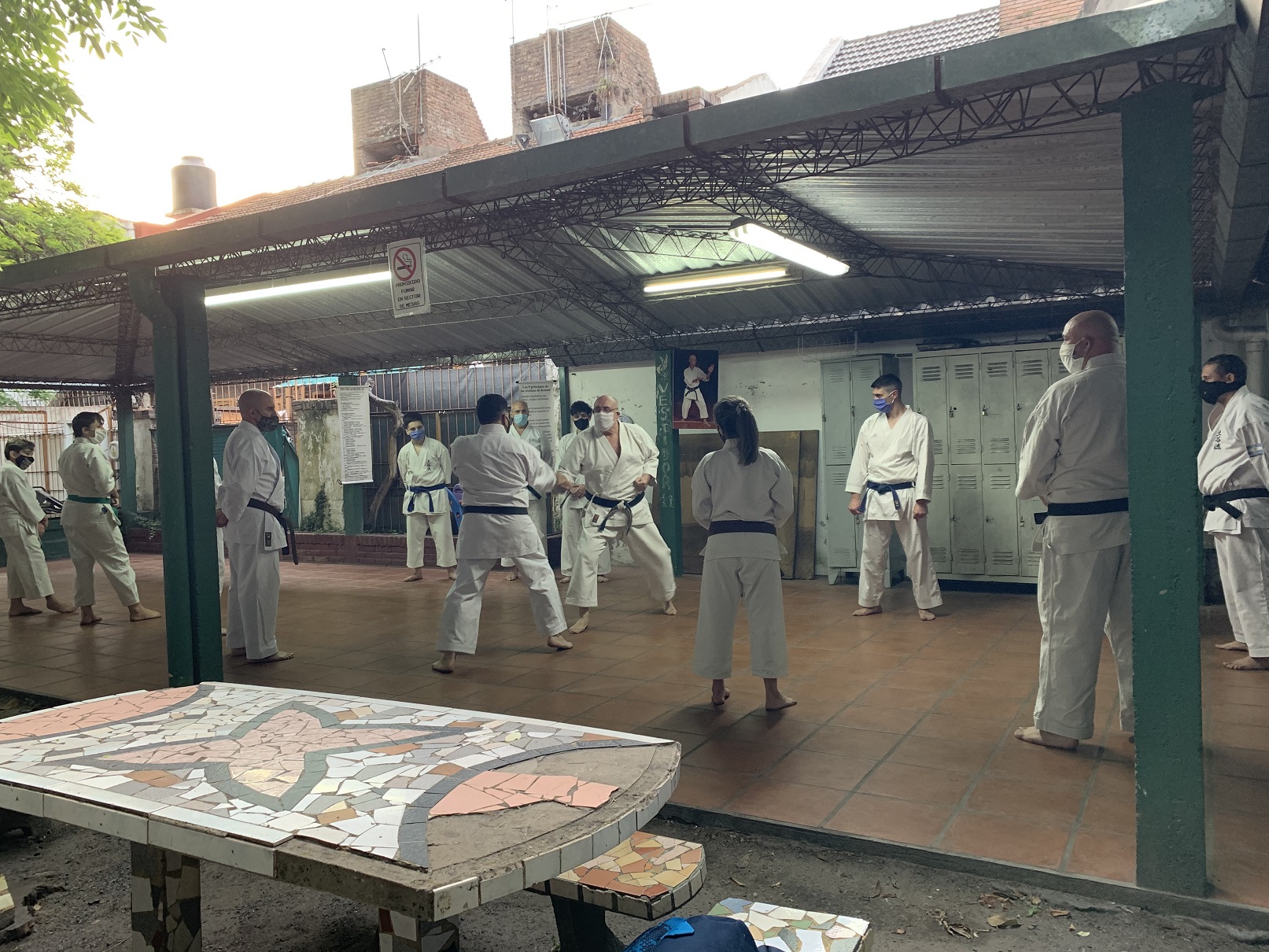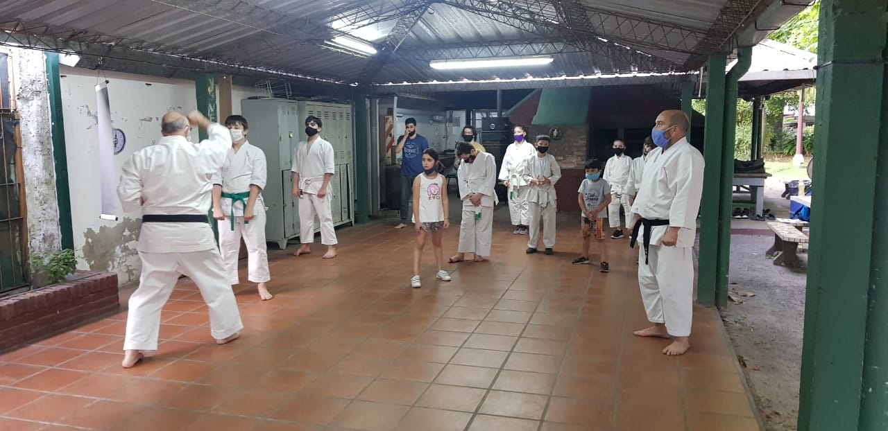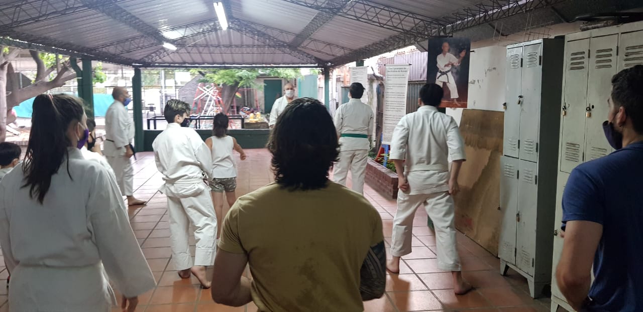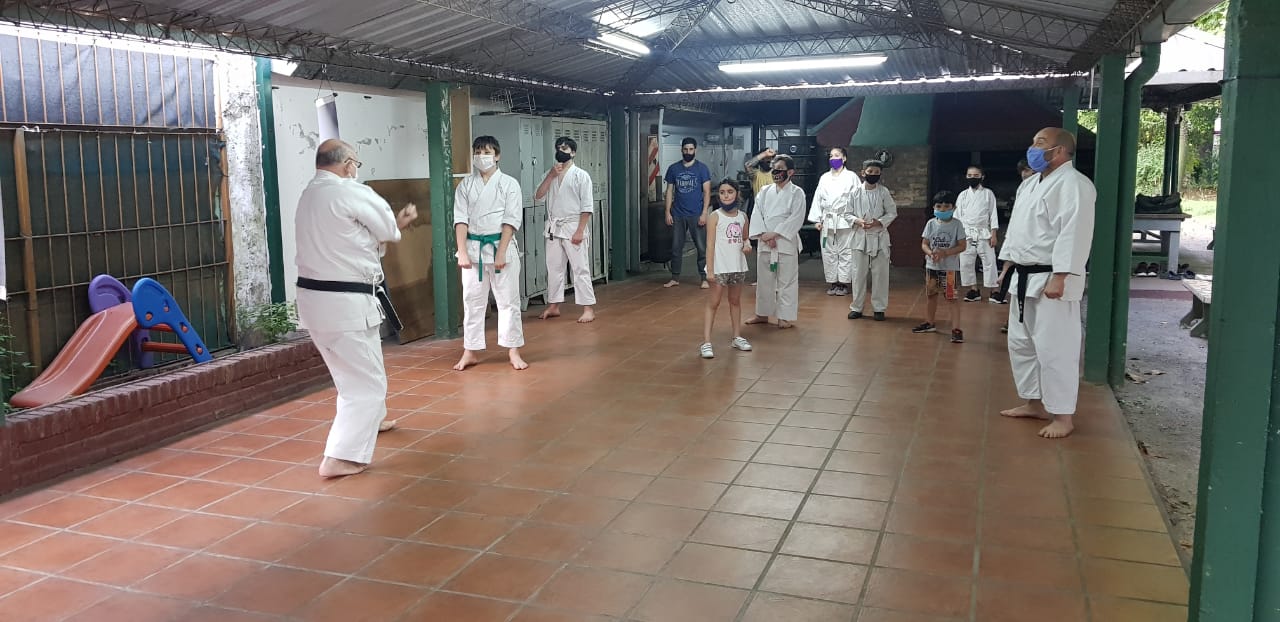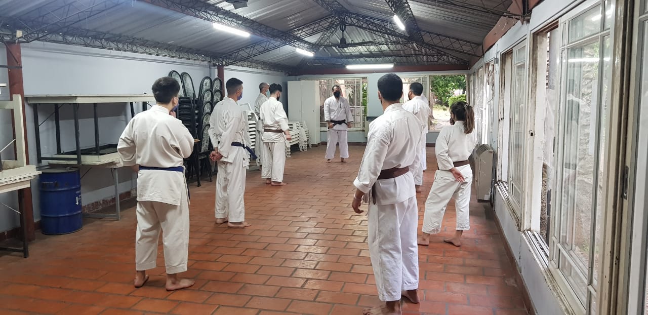 Ante estas nuevas circunstancias, a comienzos de octubre pudimos retomar la práctica presencial en el Ateneo Sagrada Familia, en la ciudad de Haedo; observando con rigurosidad los protocolos establecidos por la Municipalidad de Morón y por la Federación Argentina de Karate: mantenimiento de la capacidad de aforo, control de temperatura, sanitización de manos, uso de barbijo, ejecución de técnicas fuera de distancia de contacto y sin kiai, etc.