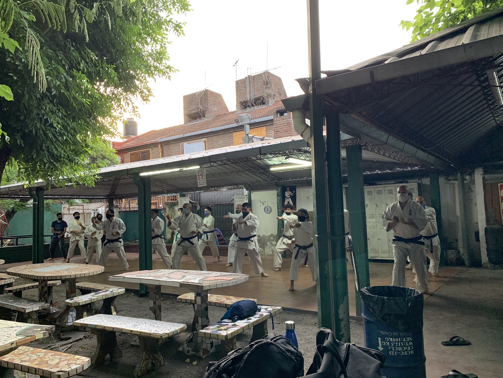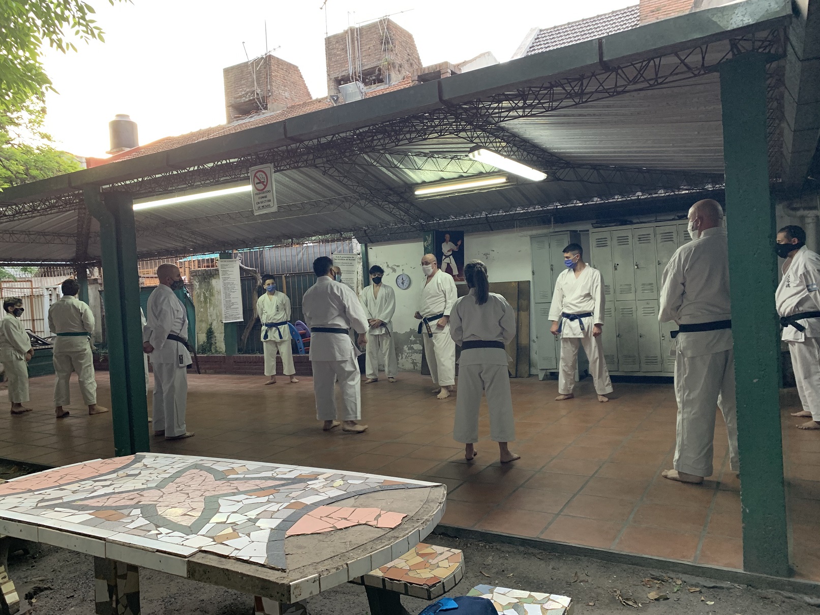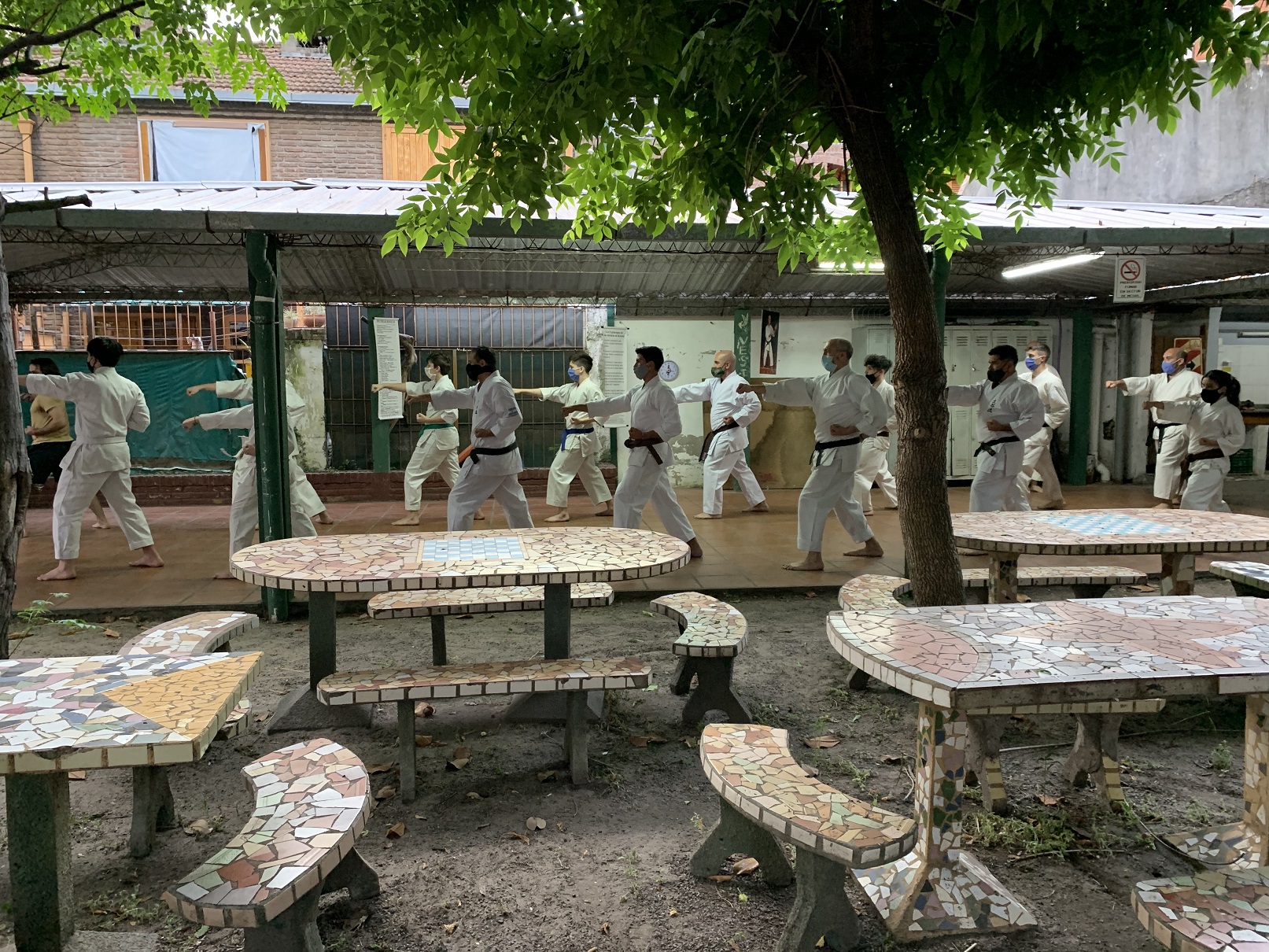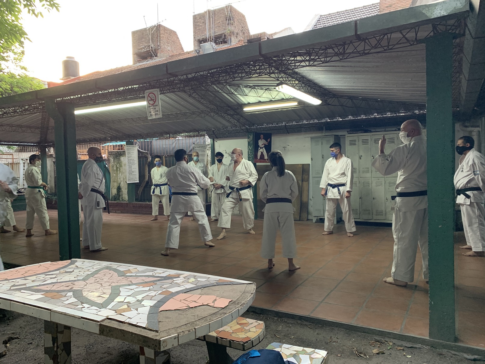 Ante estas nuevas circunstancias, a comienzos de octubre pudimos retomar la práctica presencial en el Ateneo Sagrada Familia, en la ciudad de Haedo; observando con rigurosidad los protocolos establecidos por la Municipalidad de Morón y por la Federación Argentina de Karate: mantenimiento de la capacidad de aforo, control de temperatura, sanitización de manos, uso de barbijo, ejecución de técnicas fuera de distancia de contacto y sin kiai, etc.