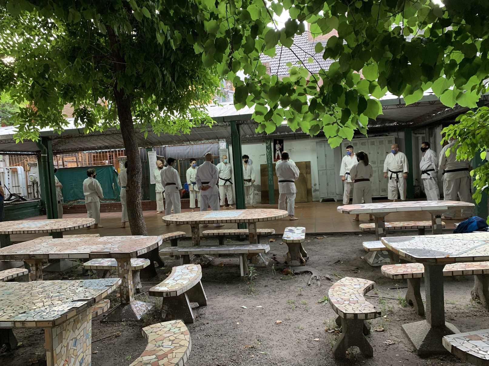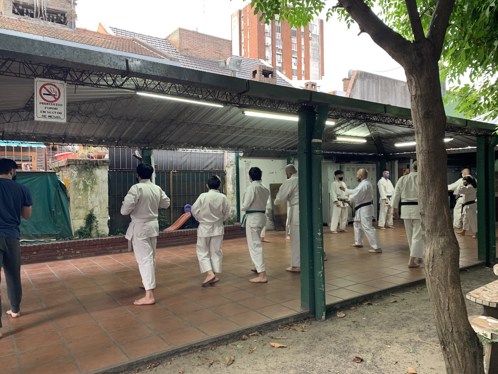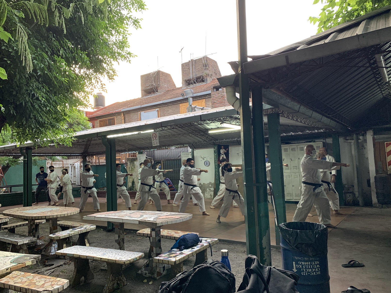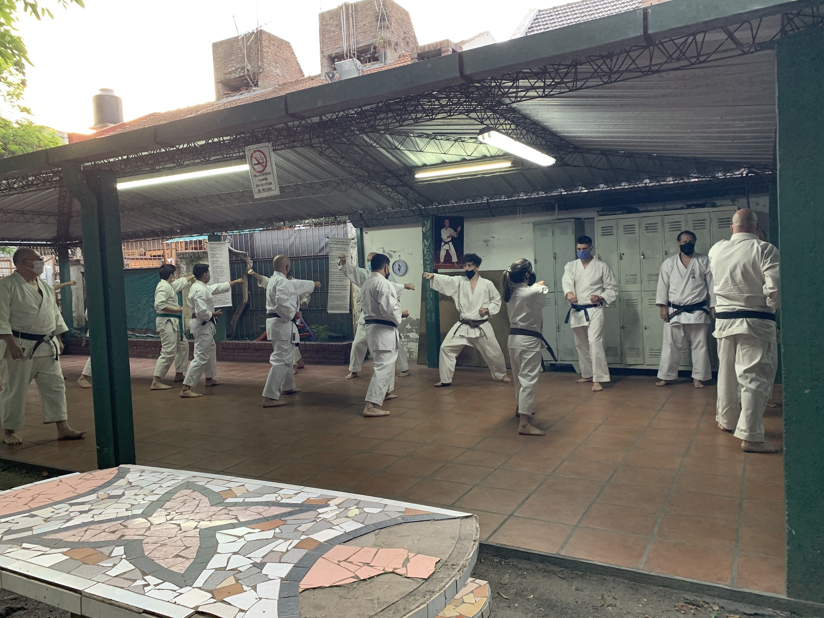 Ante estas nuevas circunstancias, a comienzos de octubre pudimos retomar la práctica presencial en el Ateneo Sagrada Familia, en la ciudad de Haedo; observando con rigurosidad los protocolos establecidos por la Municipalidad de Morón y por la Federación Argentina de Karate: mantenimiento de la capacidad de aforo, control de temperatura, sanitización de manos, uso de barbijo, ejecución de técnicas fuera de distancia de contacto y sin kiai, etc.
