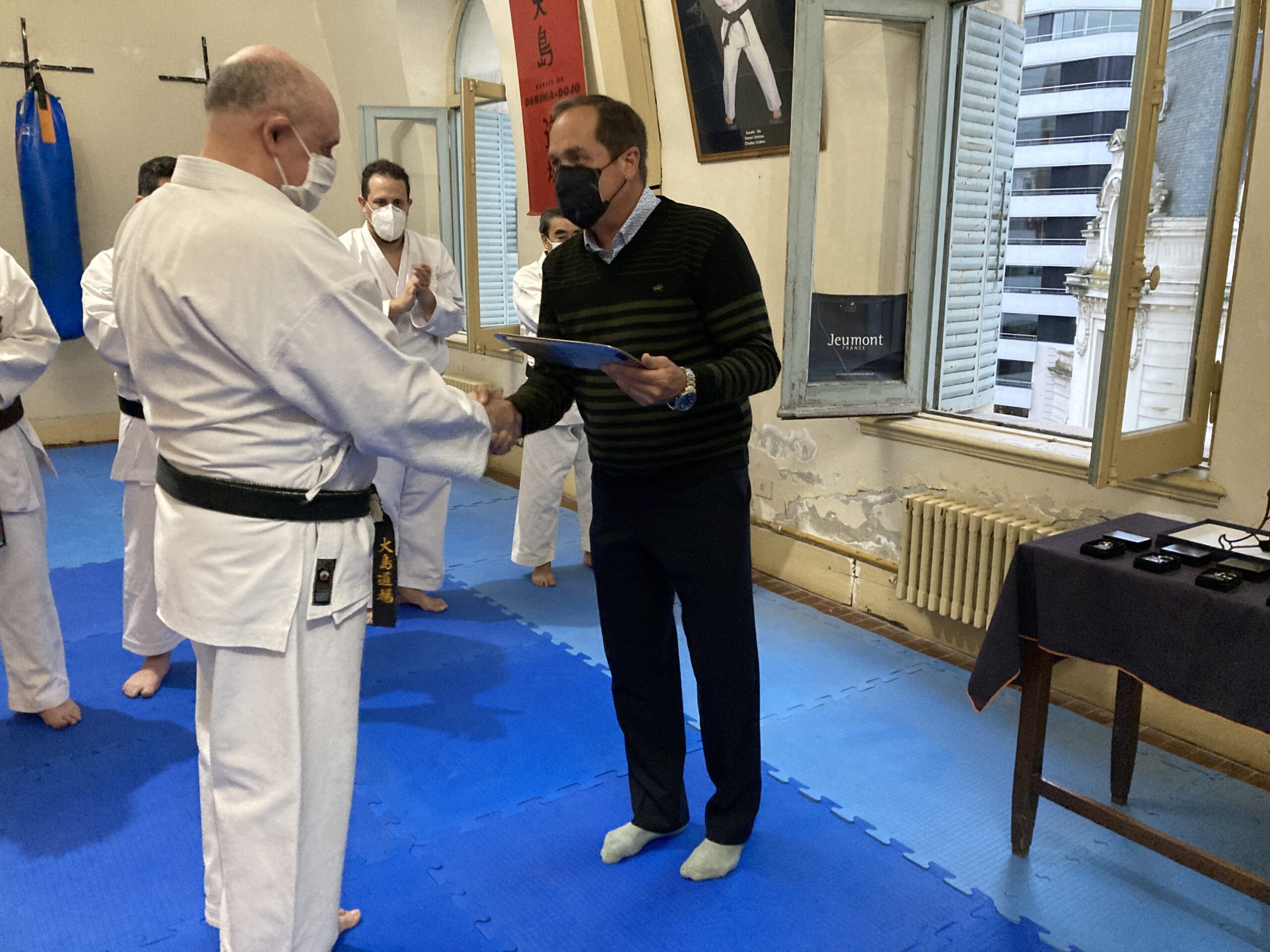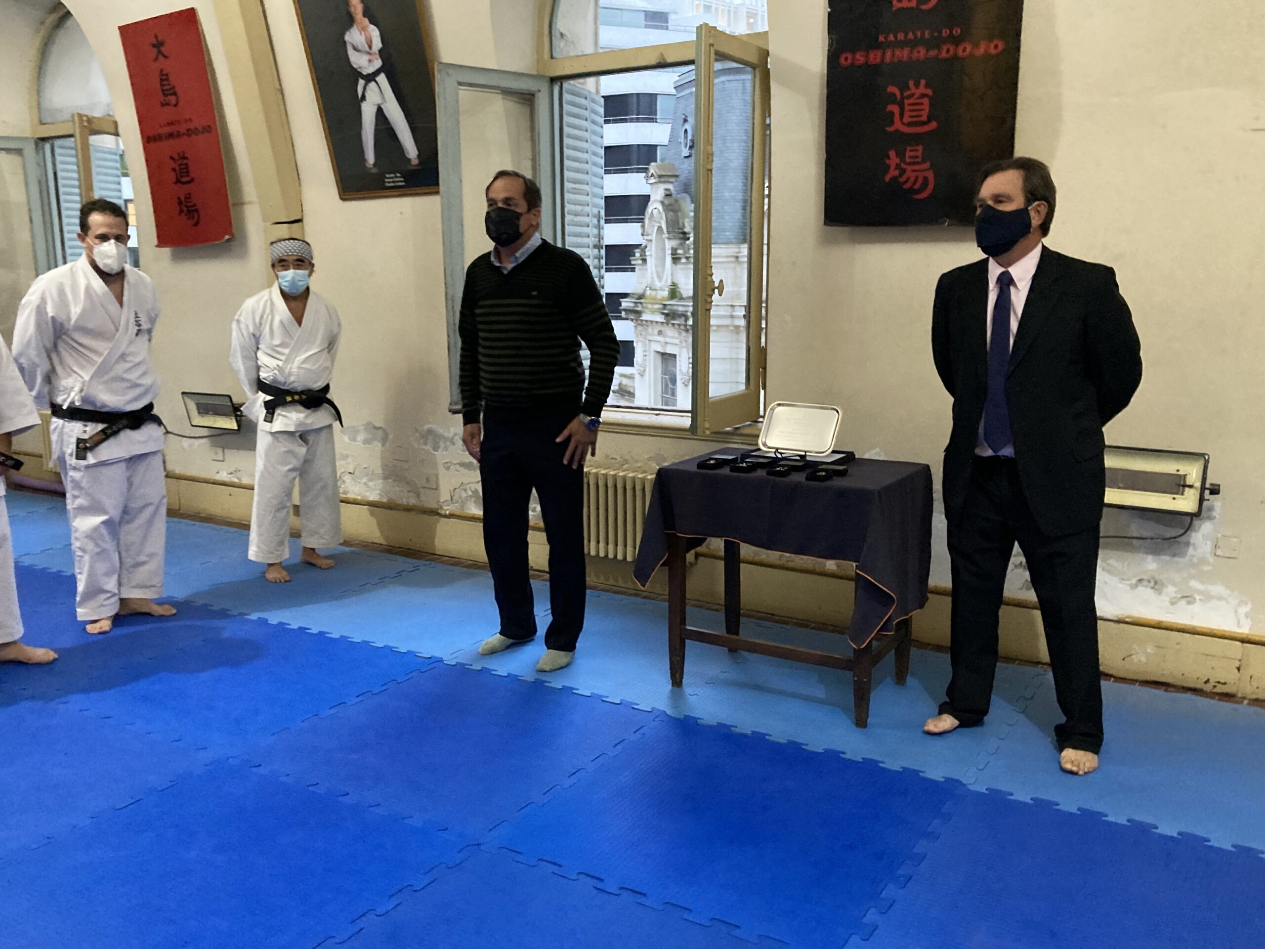 Aprovechando esta oportunidad especial, Taborda Sensei acompañado de sus alumnos hizo entrega de un presente alusivo a las autoridades del Círculo Militar, representado en la ceremonia por el Director de Deportes, Coronel (R) Jorge Alberto Bergese y por el Coronel (R) Julio Lesner, actual integrante de la Comisión Directiva, y cinturón negro de karate-do, quien también tuviera un destacado desempeño en gestiones anteriores en el ámbito de la Secretaría de Deportes, y como integrante del Comité Organizador de los Juegos Olímpicos de la Juventud de 2018, realizados en la Ciudad de Buenos Aires.